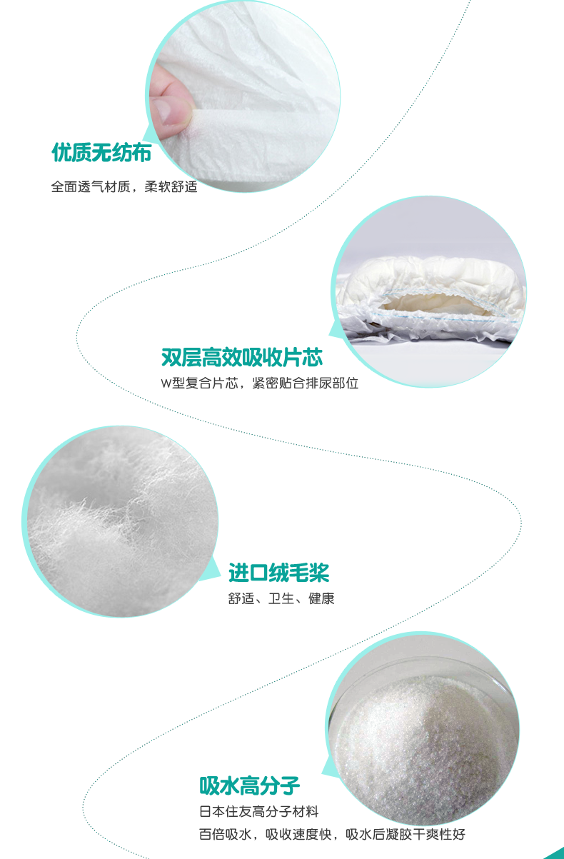 主要原料:無紡布,吸水紙,純木漿,日本住友高分子,PE膜